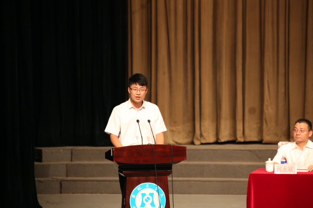 新教师代表马越发言。他为学校对自己的关心支持照顾表示感谢,并承诺会切实承担教育者的社会责任,勇于创新,严谨笃学,引导学生全面发展。